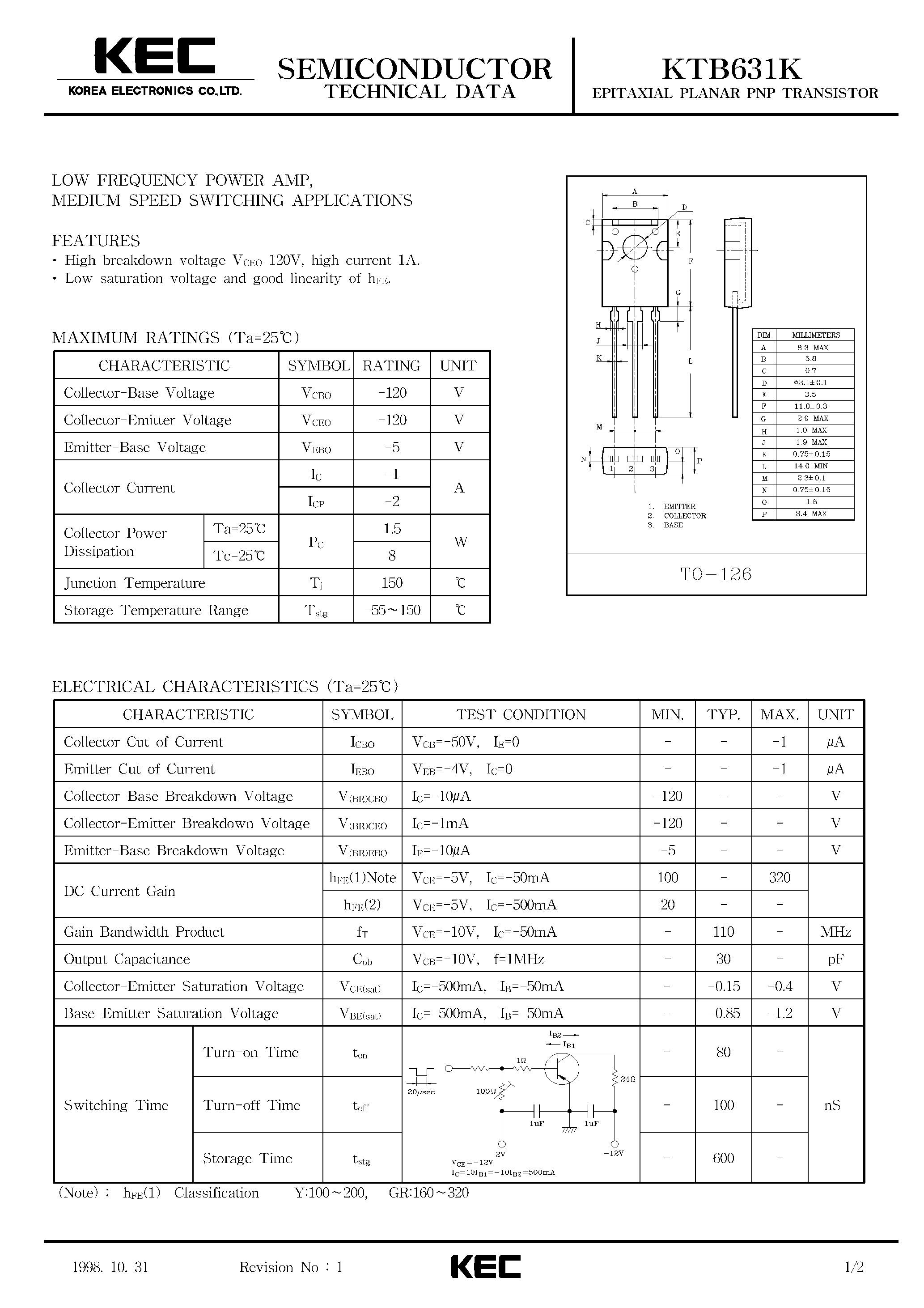 KTB631K-EPITAXIAL PLANAR PNP TRANSISTOR (LOW FREQUENCY POWER AMP/ MEDIUM SPEED SWITCHING)