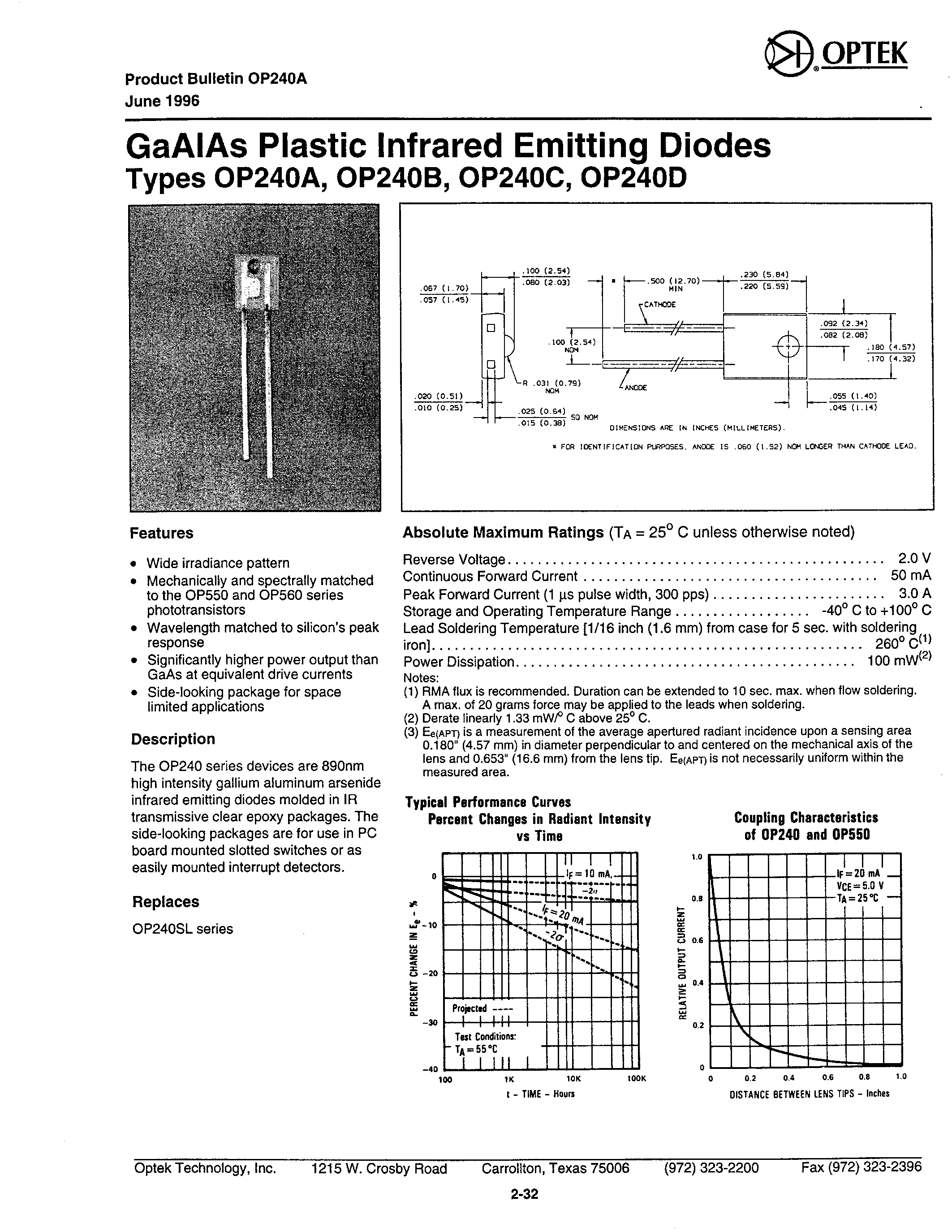 OP240A-GAAIAS PLASTIC INFRARED EMITTING DIODES