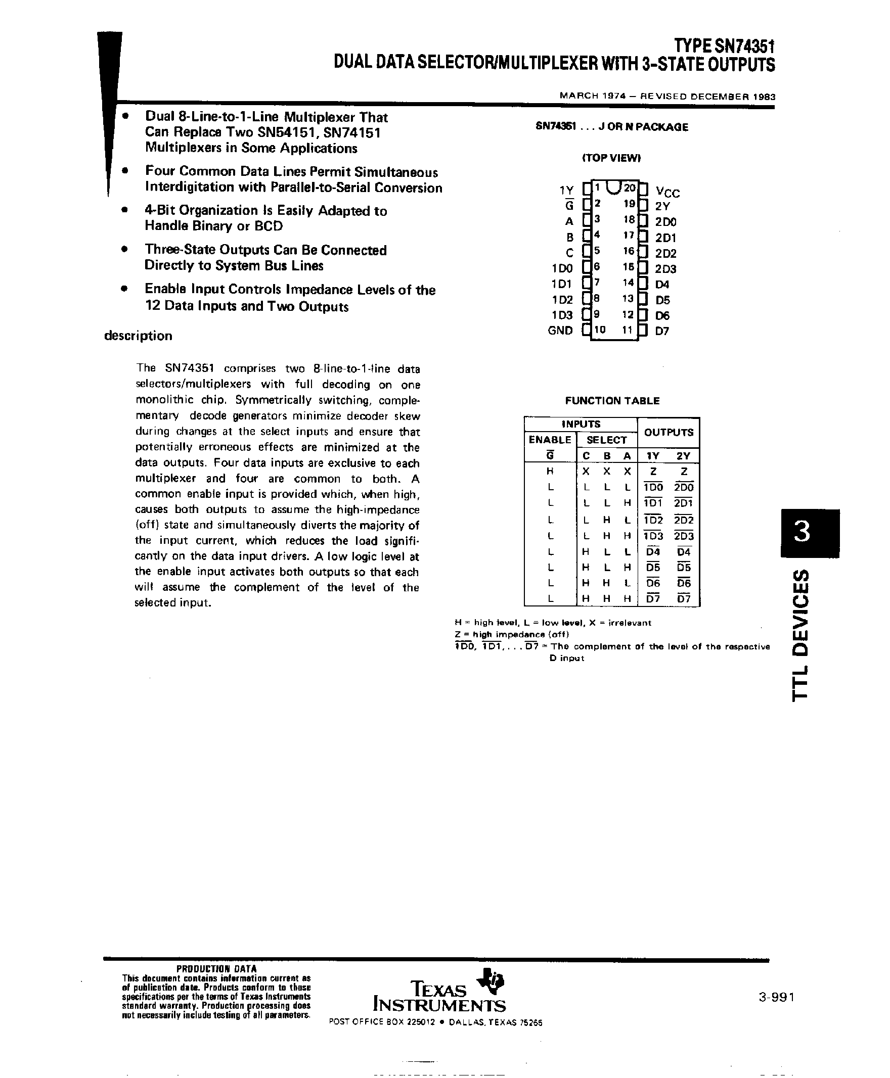 SN74351-Dual Data Selector / Multiplexer with 3 State Outputs
