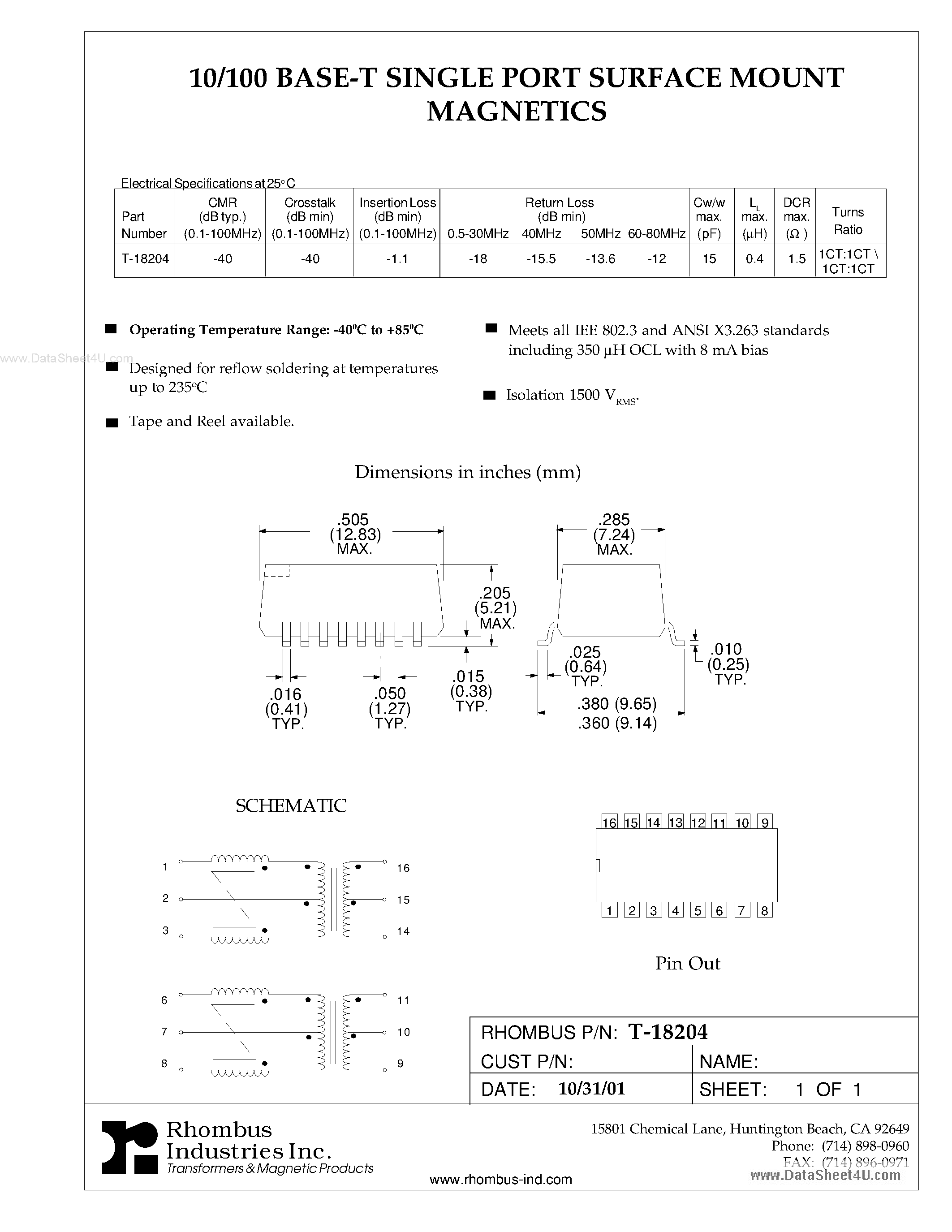 T-18204-10/100 BASE-T SINGLE PORT SURFACE MOUNT MAGNETICS