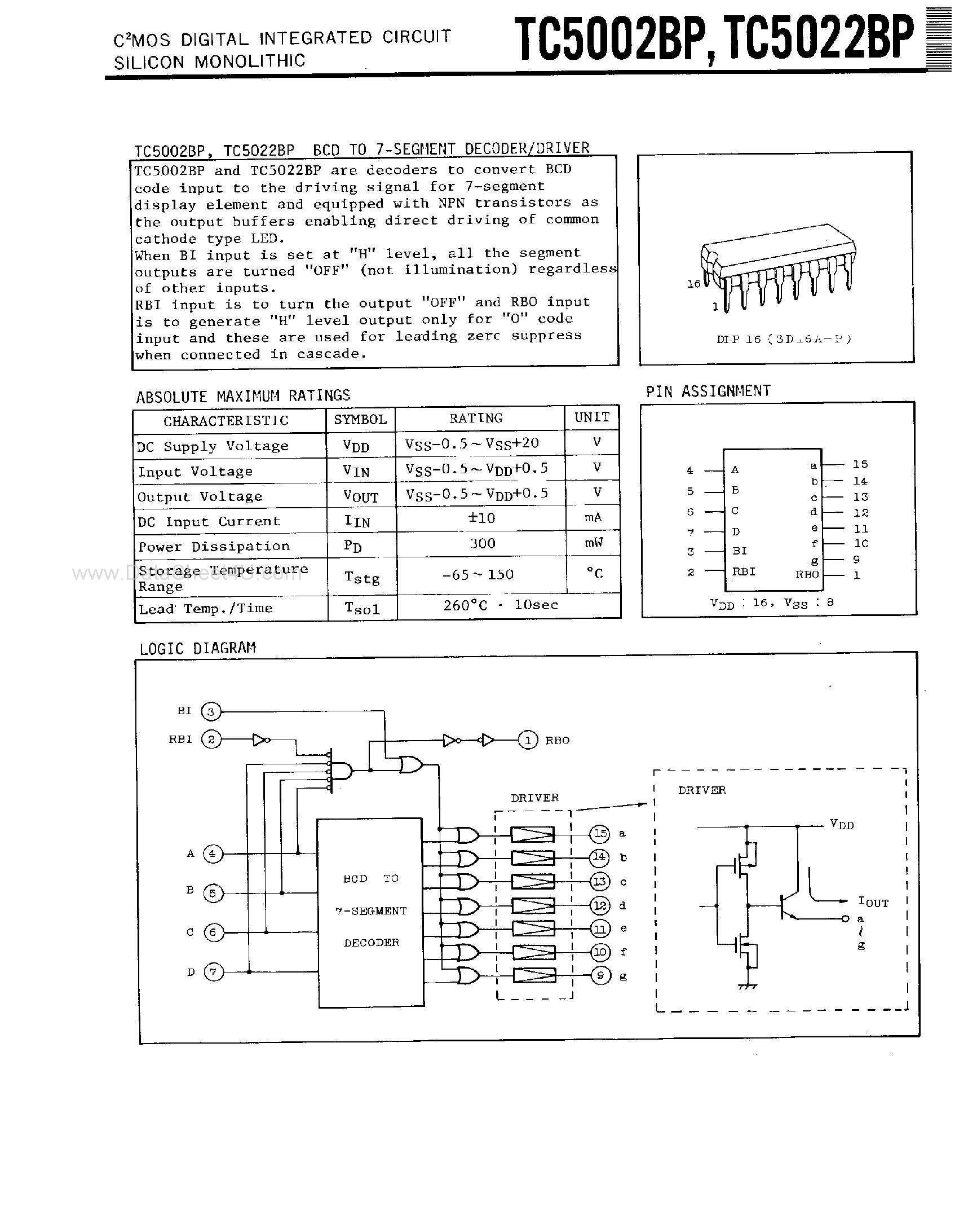 TC5002BP-(TC5002BP / TC5022BP) C2MOS DIGITAL INTEGRATED CIRCUIT SILICON MONOLITHIC