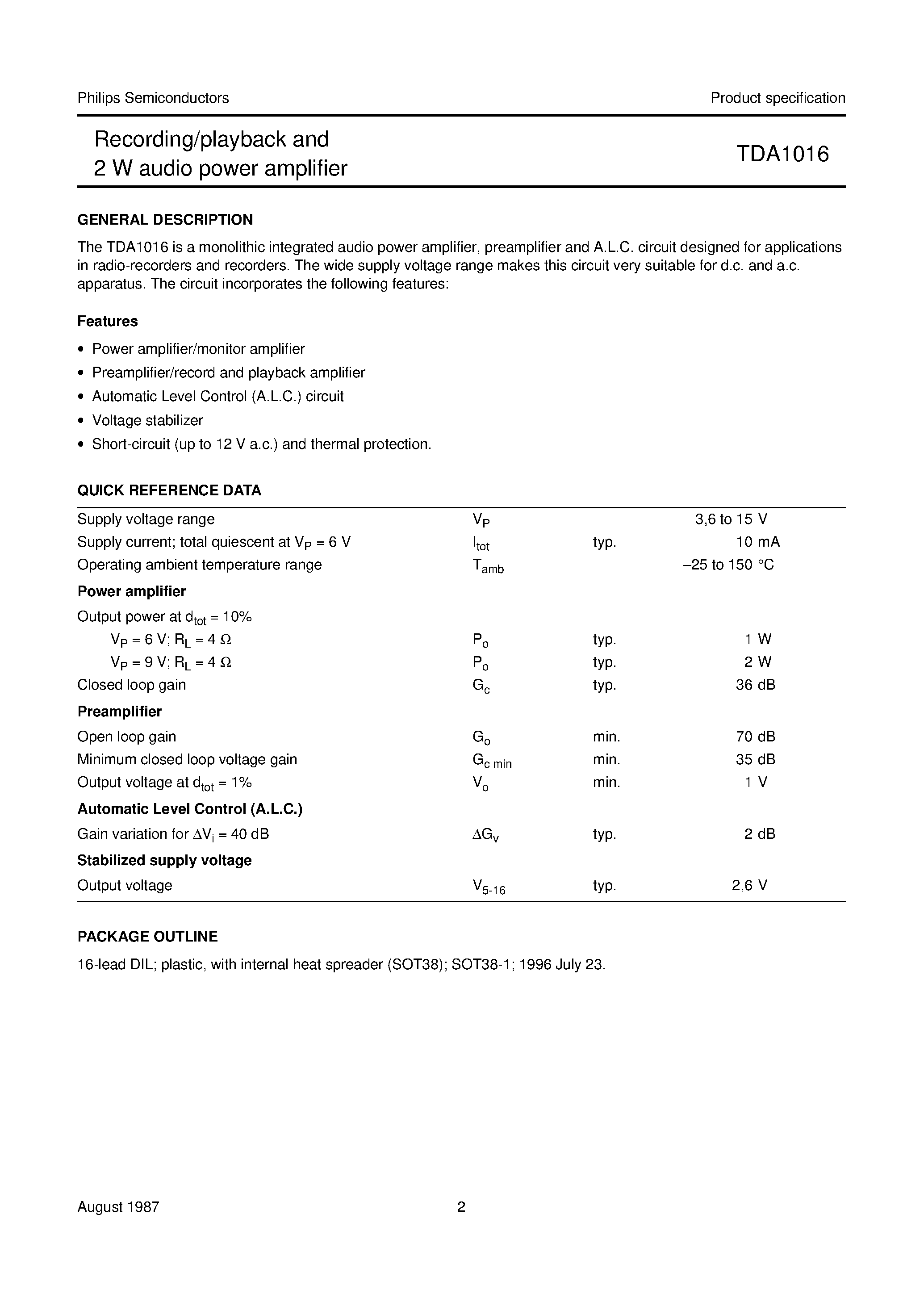 TDA1016-Recording/playback and 2 W audio power amplifier