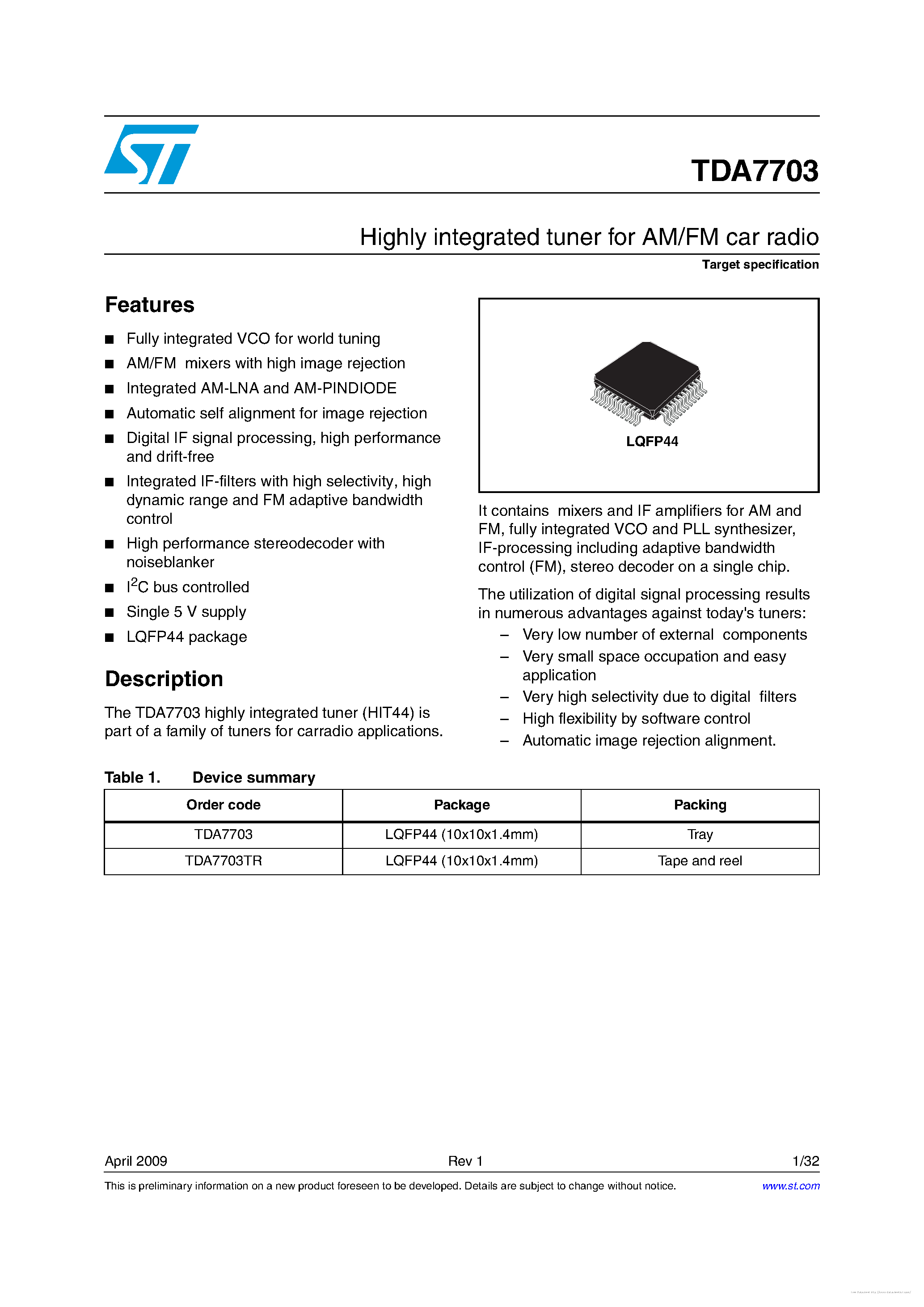 Даташиты (Datasheets TDA7703) электронных компонентов