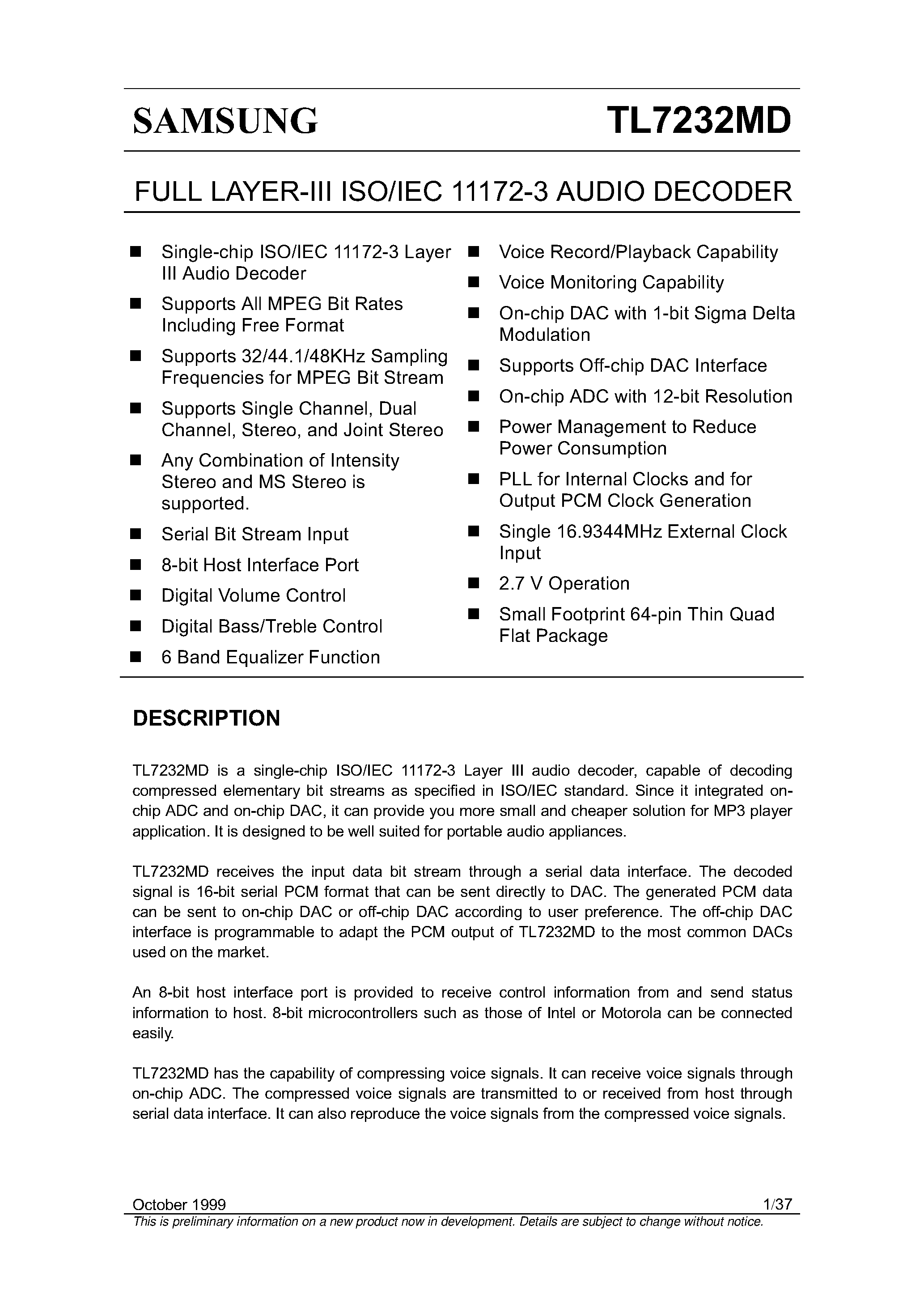 TL7232-FULL LAYER- ISO/IEC 11172-3 AUDIO DECODER