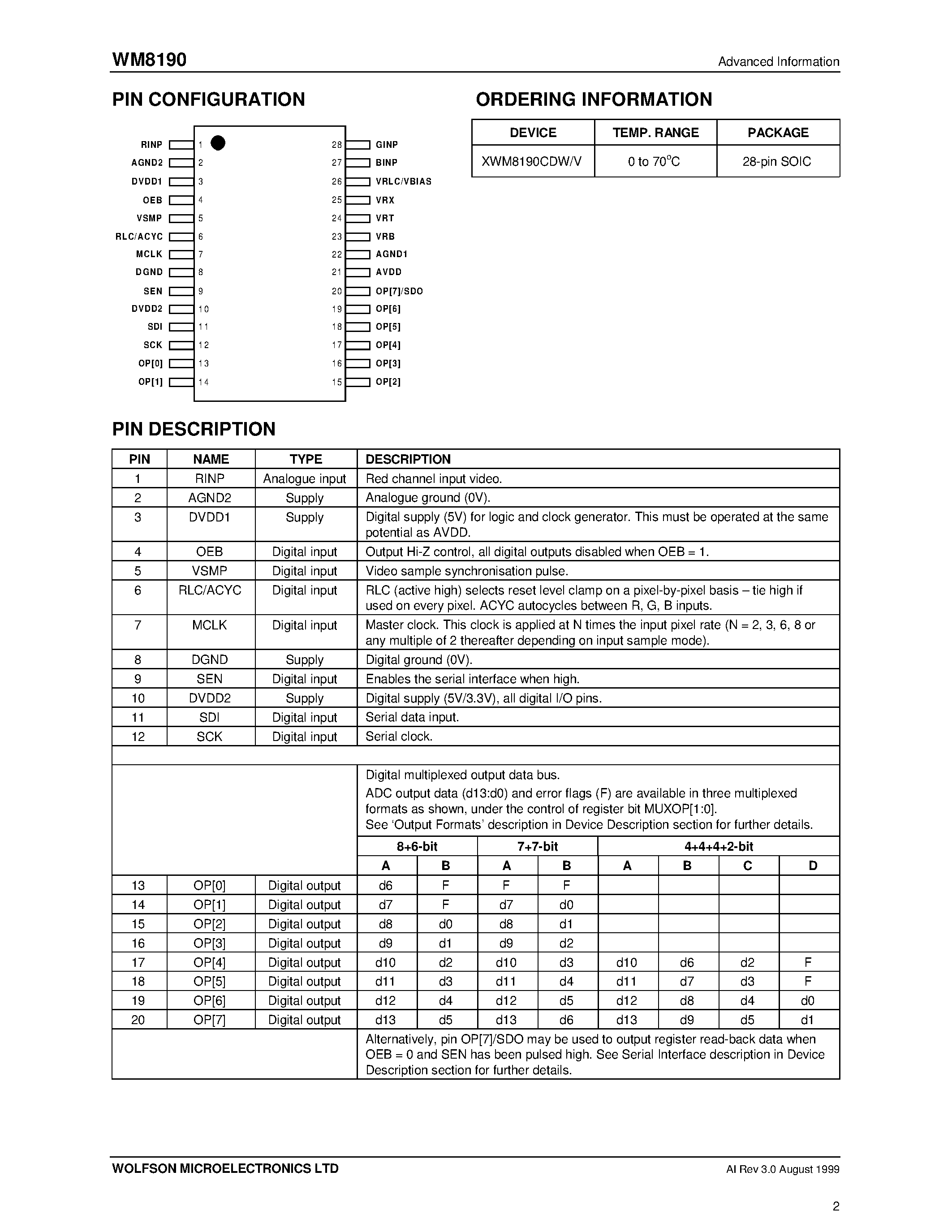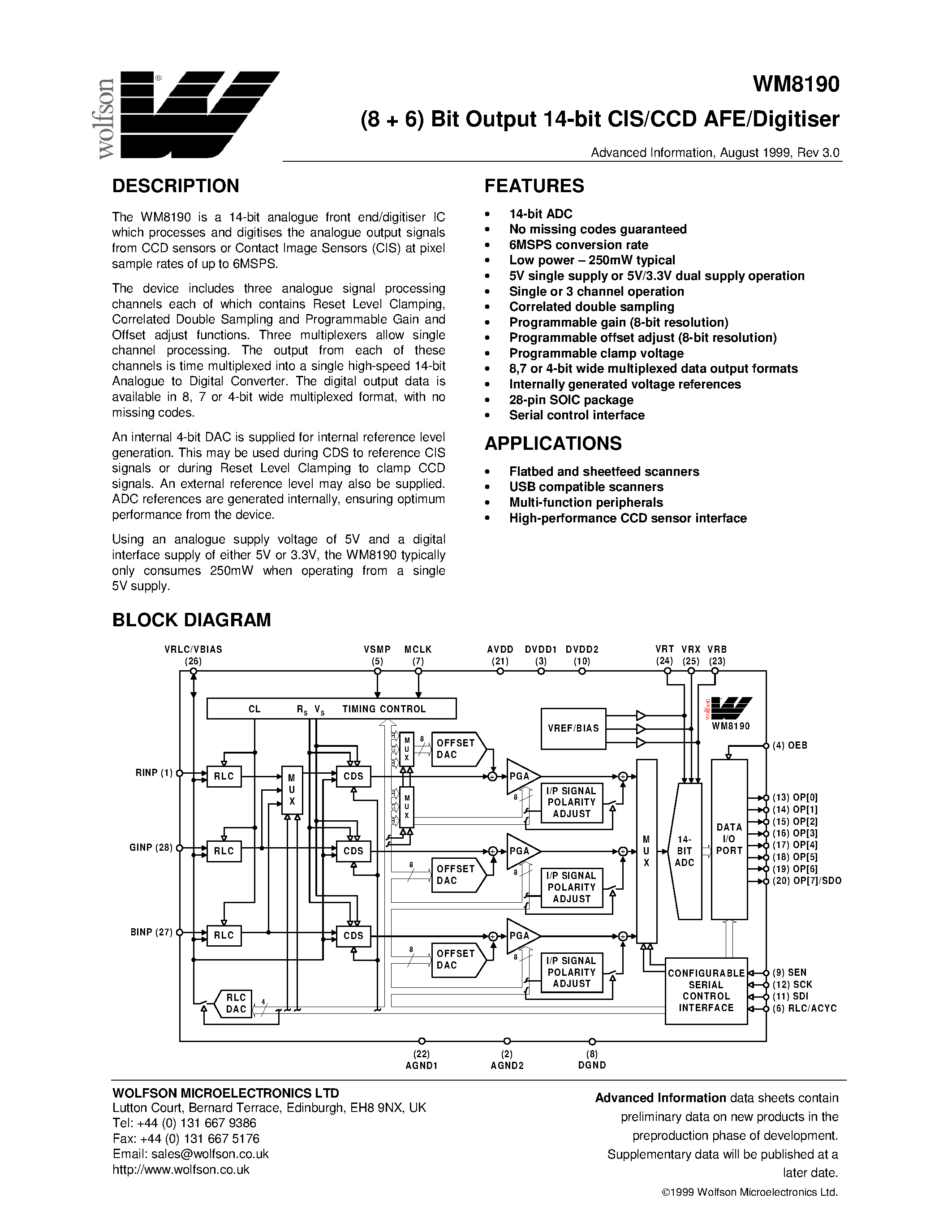 WM8190-(8+6) Bit Output 14-bit CIS/CCD AFE/Digitiser