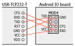 There is no single connector on the Android I/O board that exactly matches the one on the USR-TCP232-T module. However, all connectors do have the links we need: the supply voltage (3.3 V and GND) and the serial data (TX and RX). The USR-TCP232-T module also has a configuration pin. This is only required when we want to configure the module via the serial port. Since we're going to configure the module via the Ethernet network, this pin isn't really required.