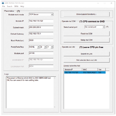 - Click on 'Search in LAN'. The program will then find the module on the network.