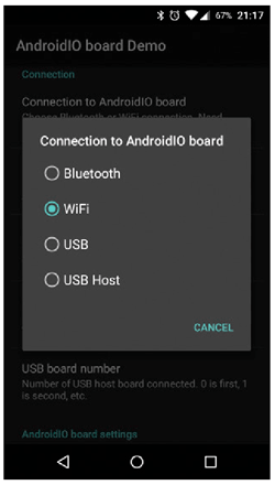 Figure 3. In de demo-app ‘Android IO board Demo’ you have to select Wi-Fi for the setting ‘Connection to Android I/O board’. In this case it
