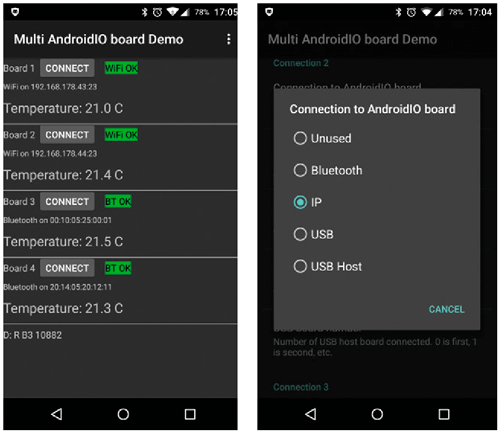 Figure 4. In the ‘Multi AndroidIO board Demo’ you can see that four different boards are connected, where the temperature of each one is shown. For each board you can select a different connection method.