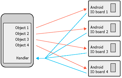 This ensures that the object IOBoard[2] will be linked to the Android I/O board with the specified IP address and port number. The data sent back from all the different Android I/O boards can be processed by a single handler. The first parameter passed with the .initiate (in this example it is '2'), acts as a channel number. It is included with all data in the '.arg1' field of the Message object [4]. This way the app will know exactly from which Android I/O board the data comes from. The figure below shows this graphically.