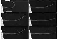 Pic: Time lapse image: Top left, the image shows a nanowire bent almost in half, and then 5 seconds after release (middle left), 10 seconds (bottom left), 60 seconds (top right), 10 minutes (middle right), and 20 minutes (bottom right) after release.