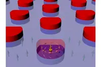 Pic: A magnetized cobalt disk (red) placed atop a thin cobalt-palladium film (light purple background) can be made to confer its own ringed configuration of magnetic moments (orange arrows) to the film below, creating a skyrmion in the film (purple arrows)