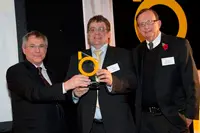 Pic: Argon Design CTO Steve Barlow, left, and chief executive Alan Scott, centre, receive the Award from Mark Larson, right, vice chairman of category sponsor Digi-Key Electronics