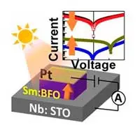 The technology is based on a ferroelectric tunnel junction (FTJ) – in which a thin layer of a ferroelectric material is sandwiched between two electrodes. In this case, a layer of samarium doped bismuth iron oxide (SBFO) – ranging in thickness from 3 to 9nm – was placed between platinum and niobium doped strontium titanate, which is light sensitive.