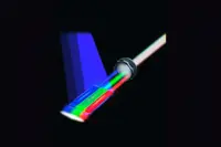 But now scientists say they've overcome that problem. The heart of the new device is a sheet, nanometers thick, made of a semiconducting alloy of zinc, cadmium, sulphur, and selenium. The sheet is divided into three segments. When excited with a pulse of light, the segments rich in cadmium and selenium gave off red light; those rich in cadmium and sulphur emitted green light; and those rich in zinc and sulphur glowed blue.