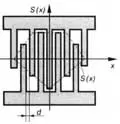 | Встречно-штыревой преобразователь (ВШП) | Планарная структура, состоящая из двух проводящих гребенок, штыри которых входят друг в друга, образуя решетку, на которую подается возбуждающее напряжение (см. рис.). Предназначен для возбуждения поверхностных акустических волн на поверхности пьезоэлектрика. Расстояние между штырями d выбирают исходя из условия электроакустического синхронизма — согласования времени пробега акустической волны между соседними штырями и полупериода изменения напряжения между ними на центральной частоте f0. Расчетная формула имеет вид d = νа/(2f0), где νа — скорость акустической волны.Конструкция ВШП и, особенно, число штырей в значительной степени определяют его частотные свойства. По равномерности распределения штырей различают эквидистантные (с равномерным распределением) и неэквидистантные ВШП. В первых для получения нужной частотной характеристики используется аподизация, определяемая как обратное пространственное преобразование Фурье от требуемой нормируемой к va частотной характеристики фильтра. В случае реализации полосового фильтра на ПАВ для получения оптимизированных по определенным параметрам фильтров используют специальные функции аподизации. |