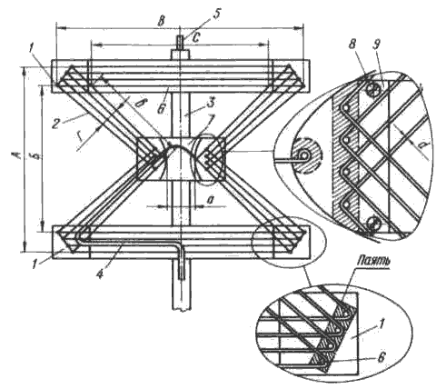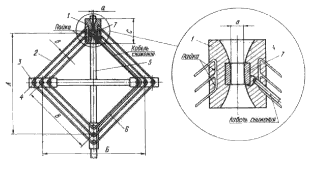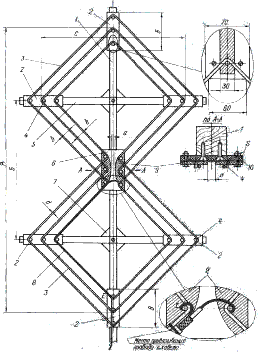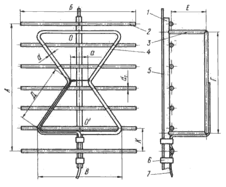 На середине антенны, между поперечными рейками, прикрепляется диэлектрическая пластина 6, к которой в свою очередь крепятся две металлические пластины с закругленной кромкой. Полотно антенны состоит из трех параллельно натянутых проводов 3 из медного провода.