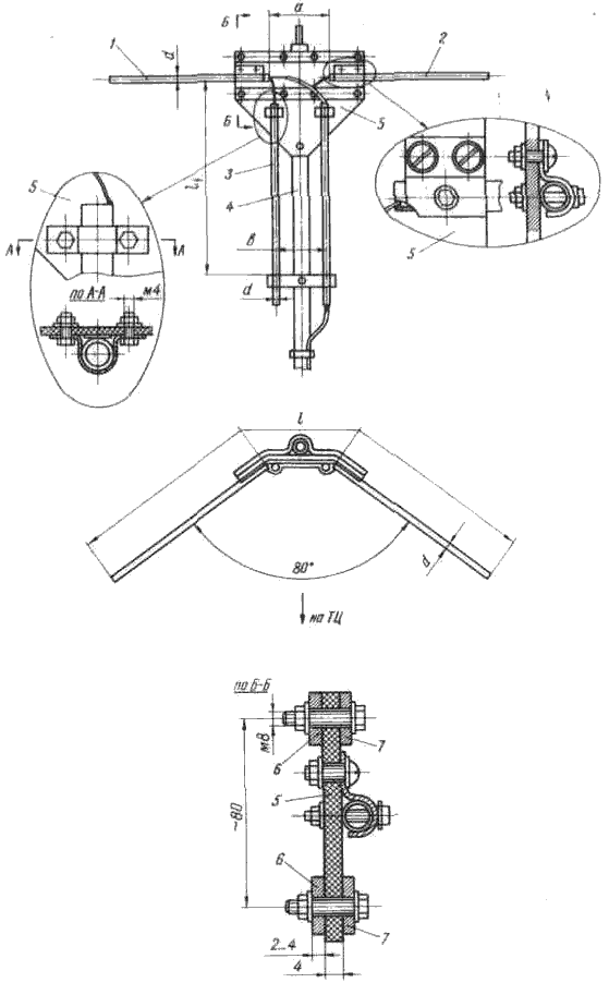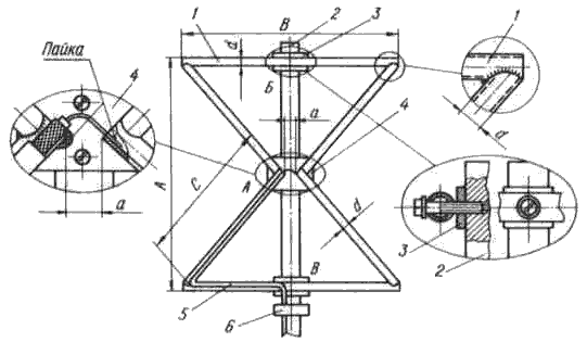 К центральной стойке снизу и сверху, а также к концам поперечных реек крепят шесть металлических планок 2, крепление которых к центральной стойке осуществляется без каких-либо изоляторов, но к концам поперечных реек эти планки укрепляются только через изоляционные прокладки.