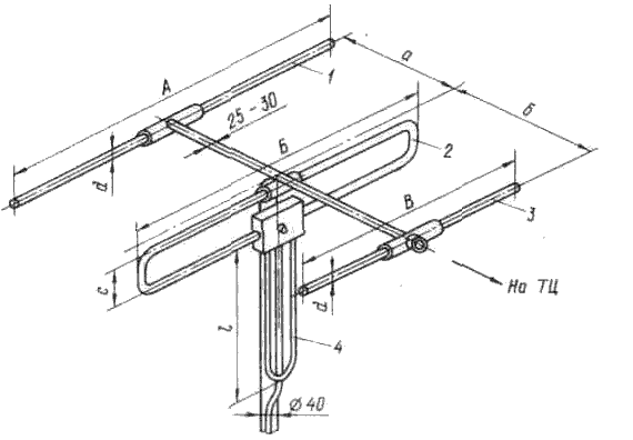 Специальным подбором размеров элементов и расстояний между ними удается создать антенну типа "волновой канал" для приема каналов, работающих на разных частотах, например на 1-м и 3-м.