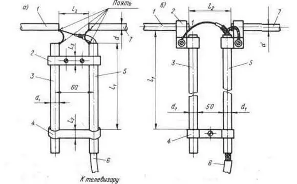 В метровом диапазоне волн широко используется симметрирующий шлейф, изображенный на рис. 6 а, который изготавливается из трубок диаметром d1 = 10—15 мм, приваренных к вибраторам из трубок диаметром d = 12—25 мм. Перемычка 2 делается из металла и накоротко замыкает оба отрезка трубки 1.
