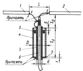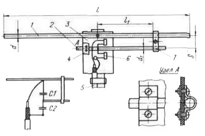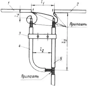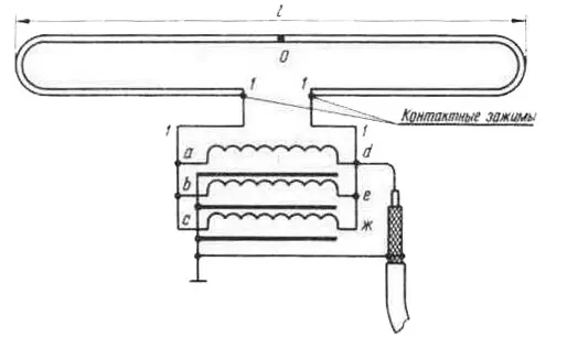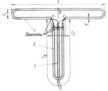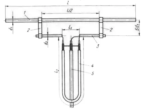 При изготовлении УСС необходимо выполнить следующее: первый отрезок трубки приваривают к тому плечу вибратора, который питается от центральной жилы коаксиального кабеля и вместе со вторым отрезком трубки и с наружной оболочкой кабеля образует двухпроводную симметричную линию. Перемычку 2 присоединяют на расстоянии l1 от входных клемм антенны.