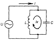 Рассмотрим цепь, состоящую из генератора гармонических колебаний и параллельного колебательного контура. В случае, когда частота колебаний генератора совпадает с резонансной частотой контура его индуктивная и емкостная ветви оказывают равное сопротивление переменному току, в следствие чего токи в ветвях контура будут одинаковыми. В этом случае говорят, что в цепи имеет место резонанс токов. Как и в случае последовательного колебательного контура, реактивности катушки и конденсатора компенсируют друг друга, и сопротивление контура протекающему через него току становится чисто активным (резистивным). Величина этого сопротивления, часто называемого в технике эквивалентным, определяется произведением добротности контура на его характеристическое сопротивление Rэкв=Q·ρ. На частотах, отличных от резонансной, сопротивление контура уменьшается и приобретает реактивный характер (рис. 8) на более низких частотах - индуктивный (поскольку реактивное сопротивление индуктивности падает при уменьшении частоты), а на более высоких - наоборот, емкостной (т к реактивное сопротивление емкости падает с ростом частоты). В процессе работы контура, дважды за период колебаний, происходит энергетический обмен между катушкой и конденсатором (рис. 9). Энергия поочередно накапливается то в виде энеогии электрического поля заряженного конденсатора, то в виде энергии магнитного поля катушки индуктивности. При этом в контуре протекает собственный контурный ток Iк, превосходящий по величине ток во внешней цепи I в Q раз. В случае идеального контура (без потерь), добротность которого теоретически бесконечна, величина контурного тока также будет бесконечно большой.