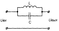 Рассмотрим, как изменяются коэффициенты передачи четырехполюсников, аналогичных приведенным на рис. 4а и рис. 4б, от частоты, при включении в них не последовательных колебательных контуров, а параллельных. Четырехполюсник, изображенный на рис. 10а, на резонансной частоте контура представляет собой огромное сопротивление току, поэтому при ω=ωр его коэффициент передачи будет близок к нулю (с учетом омических потерь). На частотах, отличных от резонансной, сопротивление контура будет уменьшатся, а коэффициент передачи четырехполюсника - возрастать. Этот случай соответствует графику АЧХ, приведенному на рассмотренном ранее рис. 5б. Для четырехполюсника, приведенного на рис. 10б, ситуация будет противоположной - на резонансной частоте контур будет представлять собой очень большое сопротивление и практически все входное напряжение поступит на выходные клеммы (т.е коэффициент передачи будет максимален и близок к единице). При значительном отличии частоты входного воздействия от резонансной частоты контура, источник сигнала, подключаемый к входным клеммам четырехполюсника, окажется практически закороченном накоротко, а коэффициент передачи будет близок к нулю. АЧХ такого четырехполюсника соответствует изображенной на рис. 5а.