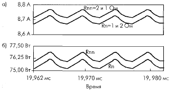 Рис. 8 Выходные напряжение и мощность моделей рис.5 и 6: а) выходное напряжение; б) выходная мощность