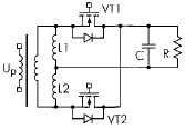 С целью снижения статических потерь вместо диодов можно использовать синхронные выпрямители на МДП-транзисторах (см. рис.1 в). В такой схеме транзистор VT1 открыт при положительном напряжении Up, а транзистор VT2 -при отрицательном напряжении Up. Транзисторами можно управлять от схемы управления и непосредственно от вторичной обмотки трансформатора.