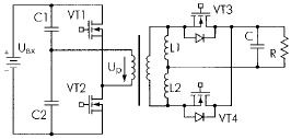 Существует несколько способов исключения сквозных токов. Первый способ - использование насыщаемых дросселей последовательно с каждым транзистором синхронного выпрямителя. Время насыщения дросселя больше времени рассасывания во внутренних диодах синхронного выпрямителя и длительности нулевого этапа напряжения на первичной обмотке. Второй способ-использование в качестве синхронных выпрямителей однонаправленных ключей, например МДП-транзисторов, у которых внутренний диод блокируется диодом Шотки.Третий способ -использование удвоителя тока. При этом дроссели подбираются таким образом, чтобы ток через них менял направление в моменты переключения основных транзисторов, тогда соответствующий внутренний диод синхронных выпрямителей не будет открываться или будет открываться позже. Рассмотрим реализацию этого способа.