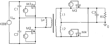 На рис.3 представлена модель полумостового преобразователя, работающего на частоте 100 кГц, Uвх=400 В. Все транзисторы управляются синхронно.