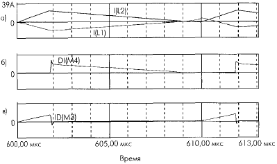 Рис. 4 Результаты моделирования: а) токи через дроссели; б) ток через внутренний диод синхронного выпрямителя М4; в) ток через внутренний диод синхронного выпрямителя М3