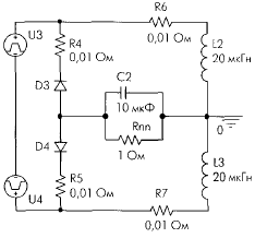 При моделировании на входе выпрямителя можно сформировать регулируемое симметричное импульсное напряжение с областью нулевой ординаты. В этом случае модели выпрямителей можно упростить. Модель двухполупериодного выпрямителя со средней точкой приведена на рис.5, а с удвоителем тока - на рис.6. В моделях принято: сопротивление диода Rs= 0,01 Ом, сопротивление канала транзистора Rds= 0,03 Ом. При таких параметрах диода и транзистора синхронный выпрямитель не нужен.