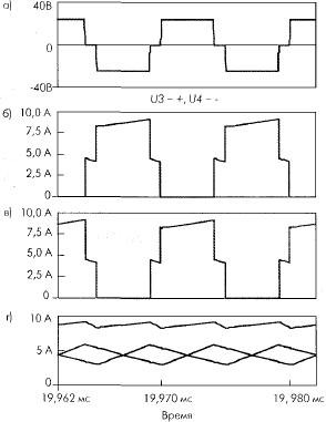Рис. 7 Процесс в модели выпрямителя с удвоителем тока: а) напряжение на входе удвоителя тока: б) ток I(D3): в) ток I(D4); г) токи -I(L2), I(L3), -I(L2)+I(L3)