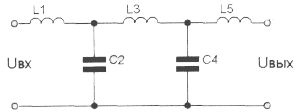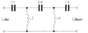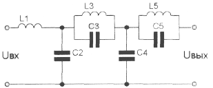 На рис. 9 приведена принципиальная схема ФНЧ Кауэра 5-го порядка. Как видно из рисунка, схемотехника таких фильтров сложнее: часть реактивных звеньев представляет собой не одиночные катушки и индуктивности, а параллельные (либо последовательные) колебательные контуры. Однако, несмотря на более сложную схемотехнику и большее число элементов, такие фильтры (как уже говорилось выше) при одинаковом порядке имеют самую узкую, по сравнению с фильтрами других типов, переходную полосу, т.е. могут обеспечить характеристику затухания вблизи полосы пропускания наиболее приближенную к прямоугольной. Это неоспоримое достоинство является причиной очень широкого применения подобных фильтров на практике.
