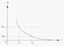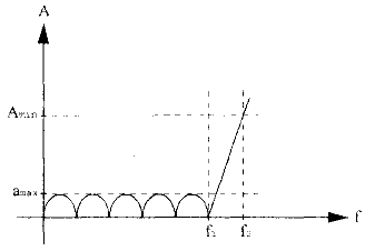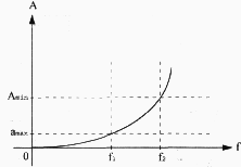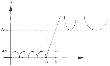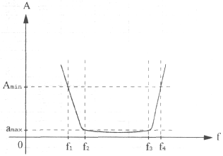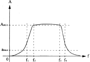 Итак, совокупность рабочих параметров фильтра включает в себя следующие: частотные границы полосы пропускания и полосы задерживания (подавления, непропускания); максимальное ослабление в полосе пропускания (или максимальную неравномерность частотной характеристики в полосе пропускания); минимальное ослабление в полосе задерживания; а также нормируются величины входного и выходного сопротивлений. Поясним суть этих параметров при помощи примера, приведенного на рис. 2 На этом рисунке приведена частотная характеристика фильтра, называемая кривой затухания. Здесь по горизонтальной оси отложена частота f, а по вертикальной - величина затухания (ослабления) А, выражаемая обычно в децибелах (дБ). Полоса пропускания фильтра, соответствующего рис. 2, лежит в пределах от частоты f2 до частоты f3, в пределах которой рабочее ослабление (затухание) не превышает величины amax (максимального ослабления в полосе пропускания). Полоса задерживания этого фильтра состоит из двух промежутков: от нуля (постоянного тока) до 11 и от 14 до бесконечности. На этих частотных промежутках затухание фильтра составляет не менее величины Amin (минимального затухания в полосе задерживания). Частотные интервалы от 11 до 12 и от 13 до 14 составляют так называемую промежуточную или переходную полосу.
