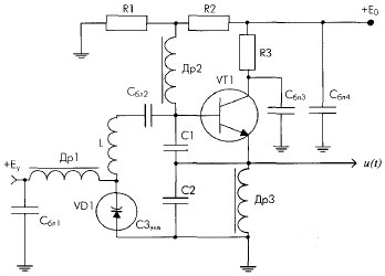 В твердотельных ГУН миллиметрового диапазона (рис.2) в качестве активного элемента используется полупроводниковая структура на GaAs с отрицательным сопротивлением. Элементы L, С1, С2 и варикап VD1 образуют колебательную систему; Др1, Др2 и ДрЗ - блокировочные дроссели; Сбл1 C6л2, Сбл3, Сбл4 - блокировочные конденсаторы; R1 и R2 - цепь формирования отпирающего напряжения транзистора; R3 - резистор ограничения рабочего тока транзистора VT1. В СВЧ-диапазоне колебательная система и блокировочные элементы выполняются в виде микрополосковых линий или иных цепей с распределенными параметрами. Эквивалентная емкость С3экв варикапа VD1 зависит от управляющего напряжения Еу на входе управления. Для улучшения характеристик ГУН вместо одиночного варикапа применяют варикапные матрицы (встречно включенные варикапные пары).