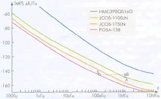 Шумовые свойства ГУН различного диапазона можно сопоставить следующим образом. Допустим, надо определить, что с точки зрения шумов более предпочтительно в радиосистеме с несущей частотой fг = 1100 МГц и зоной отстроек на F = 1 МГц: ГУН JCOS-1100LN или ИС POSA-138 с выходной частотой 137,5 МГц и последовательным малошумящим умножителем частоты на 8. Шумовые характеристики некоторых ГУН представлены на рис. 4. Из графика видно, что при одинаковых отстройках (125 кГц) Sepf/7) для POSA-138 на 13 дБ лучше, чем для JCOS-1100LN. Однако при требуемой отстройке 1 МГц применение JCOS-1100LN обеспечивает Scp(1 МГц) = -150 дБ/Гц (точка А на рис.4). В то же время, при умножении несущей частоты после POSA-138 на N= 8 отношение уровня фазовых нестабильностей к несущей не изменится и останется таким же, как и при отстройках на 125 кГц. На выходе умножителя шум Scp(1 МГц) будет равен шуму ГУН POSA-138 &р(125 кГц) = -146 дБ/Гц (точки В и Б на рис.4, соответственно) без учета дополнительного шума при умножении. Таким образом, JCOS-1100LN по уровню шума предпочтительнее POSA-138 на 4-6 дБ.