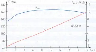 Рис. 5 Модуляционные характеристики октавного ГУН ROS-150. Сплошной линией показана зависимость fr(Ey), пунктиром - соответствующая Рвых(Еу)