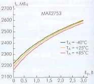 У ГУН интервалы значений управляющего напряжения Еу могут быть различны. В качестве нижней границы Еу большинство производителей указывают 0,5 или 1 В. Дело в том, что при Еу, близком к нулю, рл-переход варикапа открывается положительной полуволной высокочастотного напряжения и через него начинает течь прямой ток. Поэтому значение Еу=0 обычно безопасно, но не соотвествует номинальному режиму. Однако есть модели, в которых Еу = 0 входит в рекомендуемые пределы (М3500-0613, ROS-900PV). Некоторые ИС ГУН разработаны для схем с напряжением управления не более 3 В (VCO191-2750U), не более 5 В (JTOS-300P) и свыше 20 В (MW500-1262). Можно выделить микросхему МАХ2753, у которой при низковольтной цепи управления высокая крутизна модуляционной характеристики Sy>150 МГц/В.