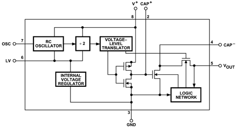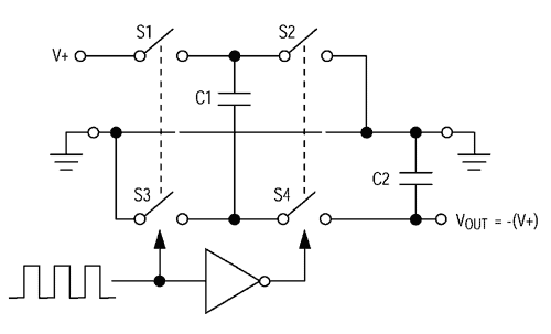 При замыкании ключей S1 и S3 и размыкании ключей S2 и S4 во время первой половины цикла внешний конденсатор С1 заряжается от источника питания до напряжения V+, а при замыкании ключей S2 и S4 и размыкании ключей S1 и S3 во время второй половины цикла конденсатор С1 передает частично свой заряд внешнему конденсатору С2, обеспечивая на выводе VOUT микросхемы напряжение -V+. Указанные значения напряжения соответствуют установившемуся режиму.