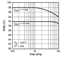 Параметры рассмотренных преобразователей зависят от частоты генератора микросхемы. Зависимость коэффициента полезного действия от частоты показана на рис.6.