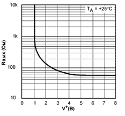 Инвертор обеспечивает получение на выходе VOUT напряжения, равного -V+ в диапазоне 1,5В <= V+ <= 10В. В реальных условиях параметры инвертора отличаются от идеальных. Так, в соответствии с рис.4 при V+=8В, выходном токе, равном 50 мА, VOUT =-6В. Снижение выходного напряжения определяется выходным сопротивлением микросхемы Rвых, которое для рассмотренного выше случая составляет 60 Ом (рис.7).