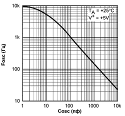 Для рассмотренного выше случая рабочая частота, равная 1кГц, достигается подключением внешнего конденсатора емкостью СOSC=100пф. При применении этого способа необходимо учитывать, что при СOSC, большей чем 1000пф, емкость конденсаторов С1 и С2 необходимо увеличить до 100 мкф.