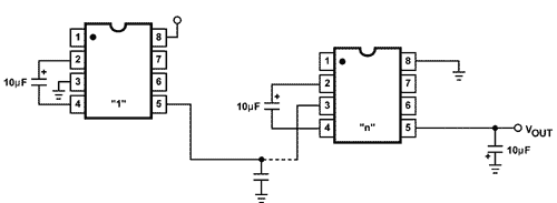 Для повышения выходного напряжения можно применять каскадное включение микросхем, показанное на рис.11.