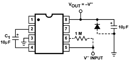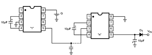 Выходное напряжение такого преобразователя равно -nV+. Учитывая допустимый диапазон 1,5В <= V+ <= 10В число каскадно соединенных микросхем не должно превышать 6.
