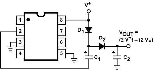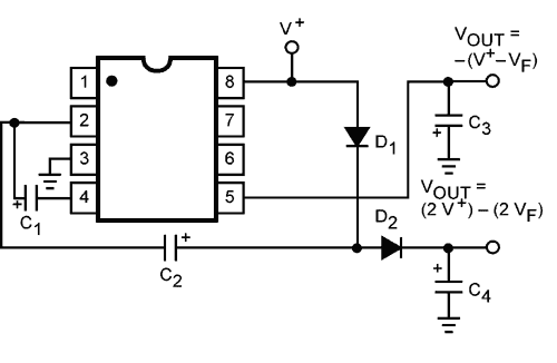 В преобразователе напряжения, показанном на рисунке, формируются напряжения -(V+-VF) и 2V+-2VF.