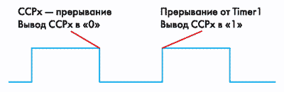 - Устанавливаем выход ССРх в "1" при возникновении прерывания от переполнения Timer1. Следует заметить, что маленькие значения длительности импульса не могут быть сформированы из-за конечного времени обработки прерывания от Timer1. Это не сказывается на периоде формируемого сигнала, так как время выполнения прерывания от периода к периоду будет одинаковым.