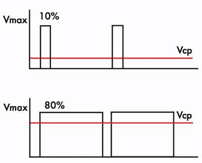 Широтно-импульсная модуляция, рассматриваемая в следующих примерах, используется в разных задачах - от формирования звукового сигнала и управления яркостью светодиодов до управления скоростью вращения электромотора. Все эти задачи основываются на базовом принципе ШИМ-сигнала - чем больше скважность импульсов, тем больше среднее значение напряжения (рис. 15). Зависимость среднего напряжения от величины скважности является линейной: