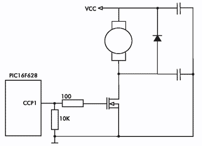 Скорость вращения двигателя пропорциональна скважности ШИМ на выводе контроллера CCP1 (рис. 16). Рассмотрим, как нужно сконфигурировать микроконтроллер PIC16F628 для формирования ШИМ с частотой 20 кГц и 50-процентной скважностью. Тактовая частота контроллера 20 МГц.